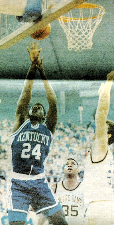 Jamal Mashburn (#24) scores inside in front of Notre Dame's Keith Tower (#5) and Kevin Ellery (#35)