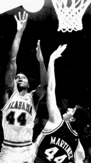 Alabama's Melvin Cheatum (#44) shoots over Gimel Martinez (#44)