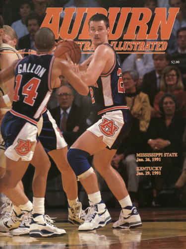 Richie Farmer looks for a teammate while guarded by Auburn's Reggie Gallon (#14)