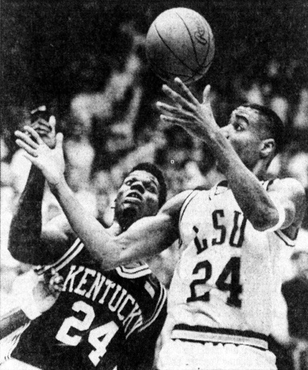 LSU's Vernel Singleton (#24) grabs a rebound in front of Jamal Mashburn (#24)