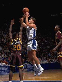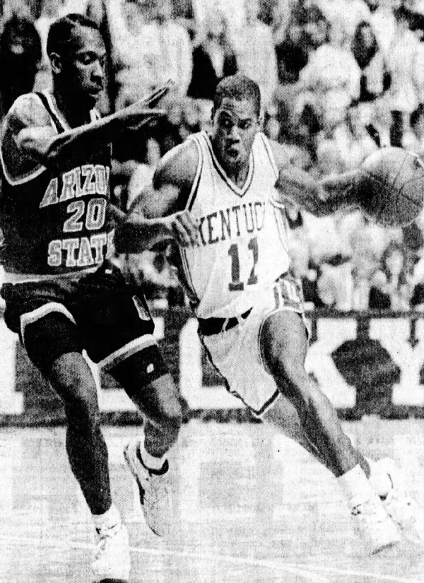 John Pelphrey (#34) shoots as he wards off ASU's Dwayne Fontana (#31) and another player