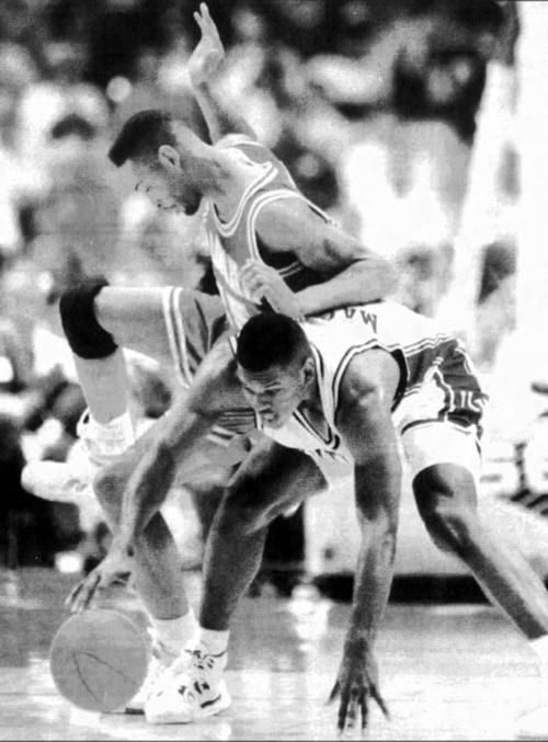Jamal Mashburn tries to secure the ball with Alabama's Robert Horry on his back