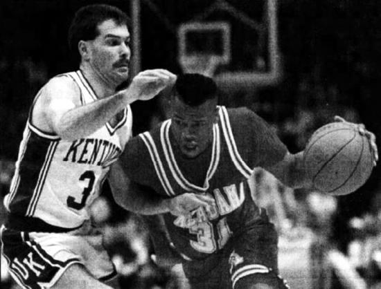 Alabama's James "Hollywood" Robinson drives while guarded by Richie Farmer
