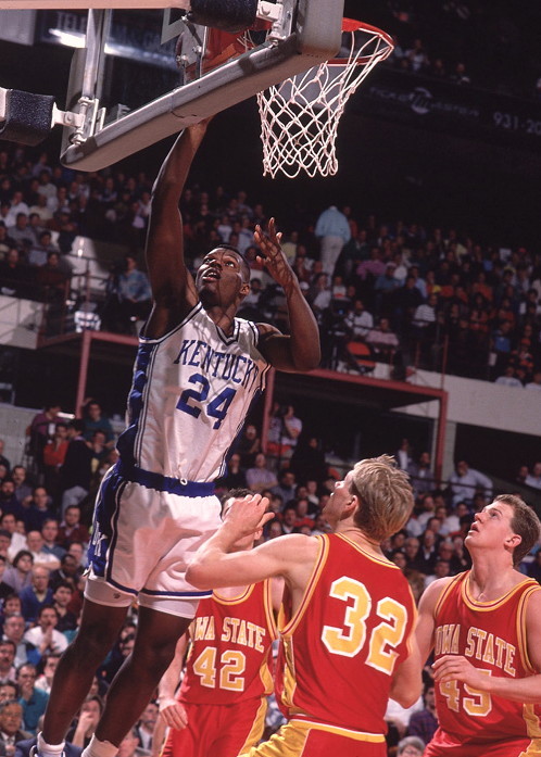 Jamal Mashburn scores inside while Iowa State's Fred Hoiberg (#32) and Julius Michalik (#42) look on