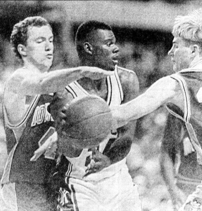 Deron Feldhaus and Gimel Martinez (#44) battle Iowa State's Fred Hoiberg and Brad Pippet for a rebound