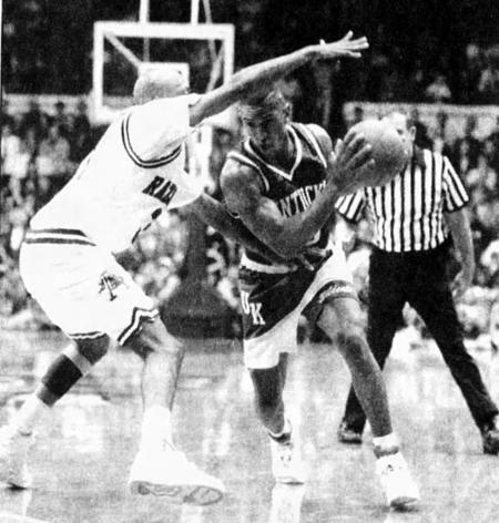 Jamal Mashburn (#24) tries to work around Arkansas' defender Darrell Hawkins while Dwight Stewart looks on