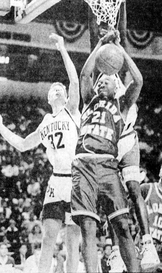 FSU went on an 11-0 spurt when UK ballhandling became poor and the Cats fumbled with many silly turnovers. This gave FSU a 1 point lead, but it didn't last long, as Dale Brown hit a 3 pointer about 30 seconds later. Brown was left unguarded outside for much of the game, and he hit well from there. FSU stayed close, however, by throwing over the top of the UK press, and it scored several layups in this way before Pitino backed off of it.