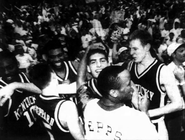 Jeff Brassow jumps for joy after scoring the game-winning tip-in as time expired