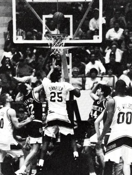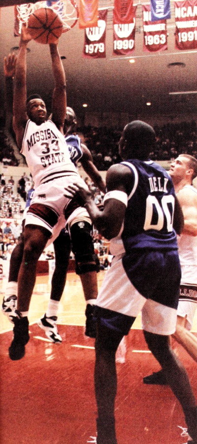 MSU center Bubba Wilson (#33) dunks in front of Tony Delk (#00) and Rodrick Rhodes
