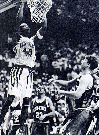 Instead of panicking, Kentucky continued patiently with its press and allowed its shots to fall, and after shots by Epps and a 3 pointer by Rhodes, UK had its first lead at 27-25 with 3.5 minutes left in the 1st half. At this point, after starting 3-20, Kentucky had hit 6 of its last 10 shots. More outside shots by Epps and inside putbacks by Prickett allowed UK to take a 41-32 halftime lead. The Cats registered 31 1st half deflections (under Pitino's system where at least 35 are desired per game). Ohio University towards the end of the half began to get itself into a little foul trouble. Gary Trent of OU scored 12 1st half points, and Epps had 13.