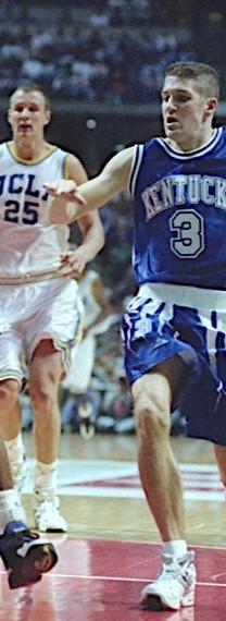 UK looked to be the better team for much of the game, taking the early lead and seldom relinquishing it except for a few minutes in both halves. Tony Delk picked up 2 fouls within the 1st 2 minutes of the game, and was largely ineffective early. At one point, McCarty inbounded the ball by simply walking onto the court (he then pretended he hadn't caught the ball, walked back off the court, and inbounded properly the second time!). The Cats were up by 8 in the 1st half (at 38-30) and UCLA had a brief 1 point lead at 25-24. The Kentucky press bothered the Bruins as UK forced a number of turnovers, and at one point UCLA had more turnovers and fouls than field goals. The Cats made enough themselves, however, to keep it close. McCarty missed a slam, and Prickett broke up a 2 on 1 break (where he was the only 1 back for Kentucky). The Cats led 38-33 at the half.