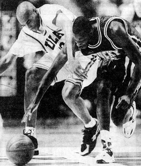 Rodrick Rhodes and UCLA's Charles O'Bannon jockey to track down a loose ball