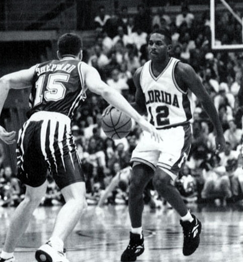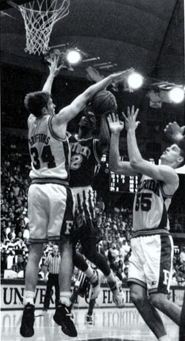The Gators seemed somewhat discombobulated by the Cat's streaks, and UK maintained leads of 25-12 (at the 10 minute mark), 30-14 (after a sensational Walker twisting shot under the basket and foul), and 36-19 (when Delk cleanly blocked and grabbed a Williams shot near the top of the key). The Gators closed to within 41-29 at halftime as Hill had an inside basket, and Cross hit a pair of FTs and also got a 10 footer. UK shot 61% from the floor in the half, but the Gators managed only 27%. Florida was 0-6 from 3 point range and had only 8 field goals.