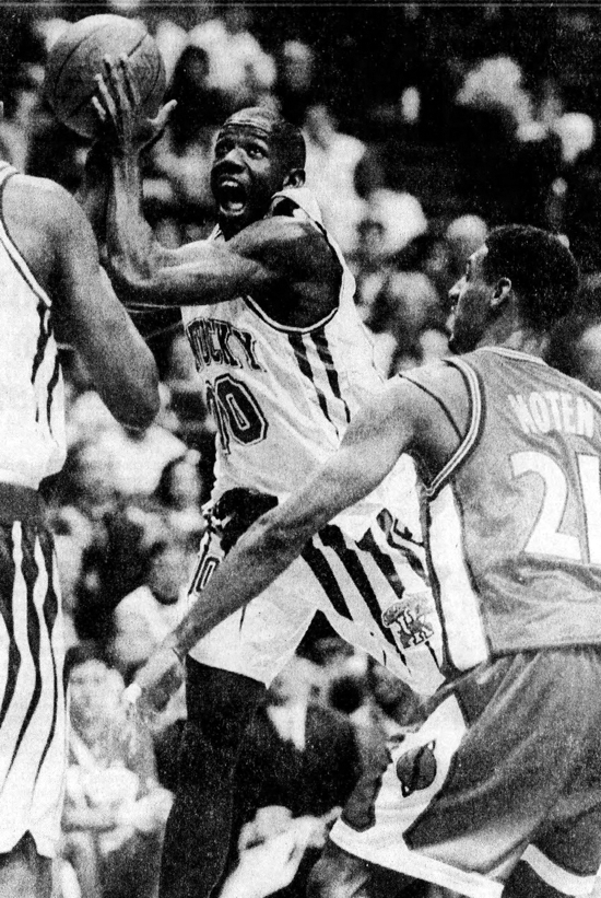 The Wildcats climbed back up to 50-42 after Pope hit a 3, but Syracuse kept it close by coming back to trail 53-52. Moten then began to come alive, hitting 3s despite good defense. His 2nd tied the game at 60-60. Delk finally hit a 3 to put Kentucky up 67-62, and McCarty dunked a putback basket to put the Cats up 69-62 with 1.5 minutes remaining. Free throws were the hallmark of the final minutes, as Rhodes, McCarty, and Rhodes again made the score 75-66. Delk hit a final dunk for Kentucky, and Moten hit a 3 at the buzzer to make the final score 77-71.