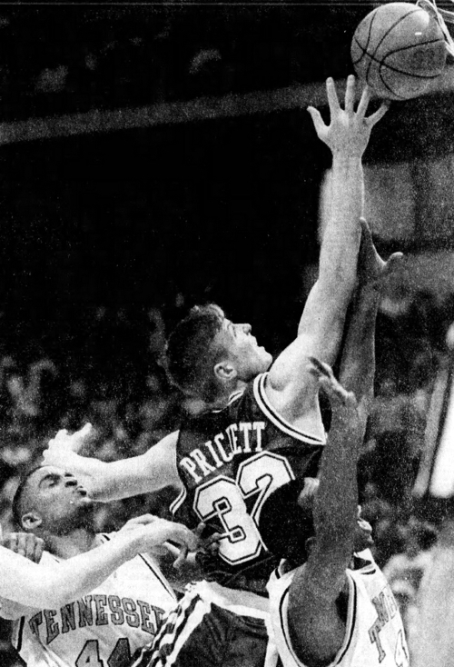 In the second half, UK had no trouble holding its lead, then enlarging it to around 20 points. With its size advantage, the Cats moved the ball both around the perimeter, and inside-outside very well. Delk had a 4 point play when fouled making a 3 to make the margin 47-29. The Vols crept to within 47-34 on shots by Johnson and Williams, but only the final margin was in doubt. Rhodes, Delk, and Prickett hit baskets to put the Cats up 56-36 with about 12 minutes remaining. Jared Prickett in fact had several nice bank shots and close-in baskets due to his size advantage on his man.