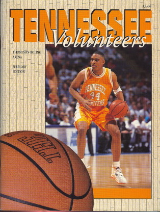 It look UK some time to adjust, however. The Vols went up 4-3 on a Whitted drive, and a later Johnson basket put them up 6-3. It became apparent early that Tennessee planned to use as much of the shot clock as possible on each possession. Delk hit a pair of FTs to close to within 6-5, but Williams nailed a 3 to let UT go up 9-5. After a Prickett putback of a Rhodes 3 miss, Whitted hit on a 14 footer, and when Carnes hit a 3, Tennessee had their largest lead of the night at 14-7. McCarty promptly hit a 3, and a Pope putback and Prickett 10 footer tied the game at 14-14. UK went up 19-14 on shots by Pope, a McCarty FT, and a Prickett inside basket (Jared was often guarded by a man 6'0", so he had little trouble shooting). Kentucky's heavy press forced many UT turnovers. UT closed to within 21-18 on shots by Williams and Johnson, but another Wildcat surge pushed the lead to 29-19 aided by a Delk 3 and an Epps 3. Delk hit a long 3 during this surge to give him his 5th point and allow him to join teammate Rod Rhodes in Kentucky's "1000 Point Club".