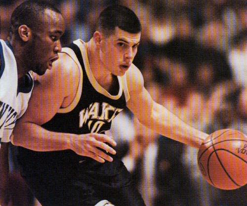 Tony Delk gets Jerry Braswell (#25) to leave his feet while Steven Goolsby (#5) and Tim Duncan (#21) look on