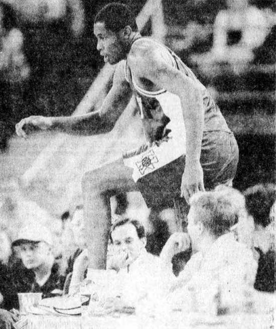 UK Freshman Jamaal Magloire climbs back over the press table to return to action