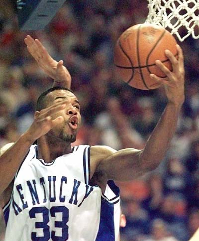 Ron Mercer (#33) attempts a reverse lay-up while defended by Notre Dame's Phil Hickey (#55)