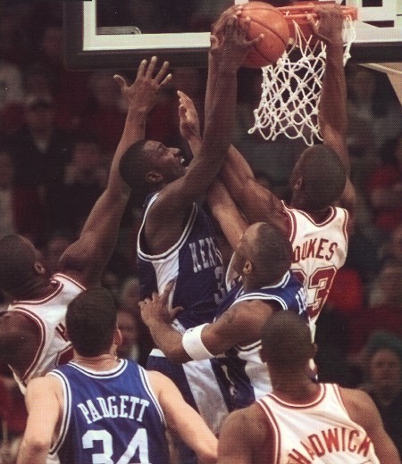 Georgia's Larry Brown (#4) struggles to score inside against the defense of Nazr Mohammed and Jared Prickett
