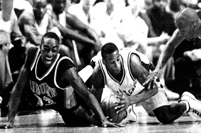 Wayne Turner(#5) tries to stop Wes Flanigan's lay-up attempt