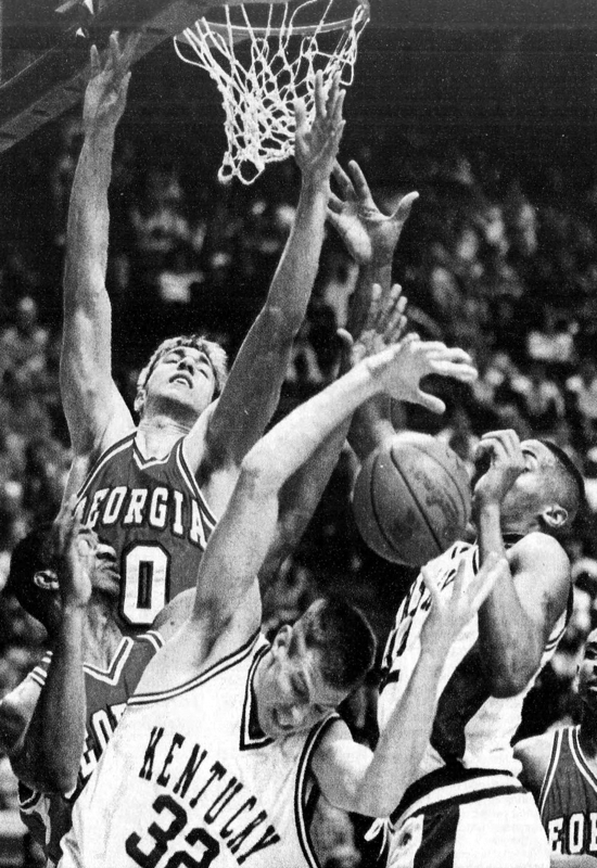 Jared Prickett (#32) loses the rebound in front of Georgia's Eric DeYoung and Badi Oliver