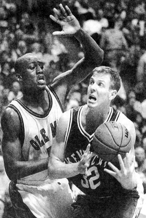 Nazr Mohammed (#13) blocks Keith Carter's shot from behind while Jared Prickett defends the basket