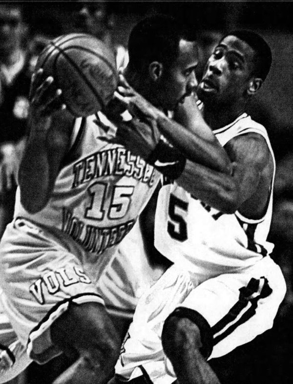 Wayne Turner (#5) defends against Tennessee's Brandon Wharton (#15)