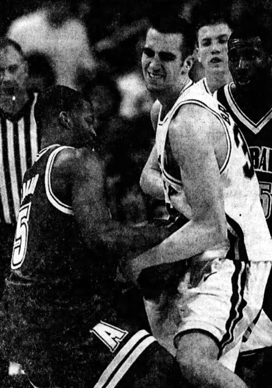 Mike Bradley's 10 pts and 6 rebounds were his career highs at UK (and he set 4 other highs - 2 steals, 4 baskets, and 7 shots). Scott Padgett managed a double double, with 12 pts and 13 rebounds. Demetrius Alexander achieved a double double for Alabama, scoring 10 and grabbing 11 rebounds. Heshimu Evans was suffering from allergies, and wore a strip across his nose for the game (it didn't prevent him from plucking 10 rebounds for the game).