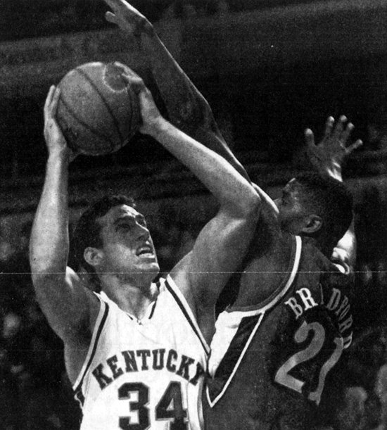 Kansas closed the gap a bit early in the 2nd half, but even so, after a Robertson 3 and a Boschee 3, it was still 44-31. Padgett made a FT, Turner scored on a drive, Pugh hit 2 FTs, then Camara scored inside to make it 49-33. Gregory hit a 3, then Turner made another great drive. Earl and Chenowith combined to make it 51-41 at the next TV timeout, and after a frantic series, Earl was fouled and made 1 FT to close the gap to its narrowest in the 2nd half at 51-42. But Prince hit an 18 footer to end a 4 minute Wildcat scoring drought, and Turner was fouled on a drive and made both FTs (in fact, it was late in the game before Turner missed anything) to put the Cats up 55-42 with around 8 minutes remaining in the game. Turner had 1 more FT later, and Bradley had a putback basket, to make it 58-42. Padgett began hesitating on his shots, and Boschee promptly stole the ball and made a 3, which turned out to be the last scoring by the Jayhawks. Turner made yet another superlative driving basket, and Smith added 2 FTs, and after a final Turner FT, UK's scoring was completed and a 63-45 victory was produced. Coaches Smith and Williams shook hands at midcourt before the final seconds had ticked away. The Jayhawks scored only 3 pts in the final 9 minutes of the contest.