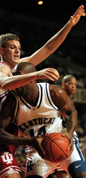 UK got the opening tap, and Turner drove for a tough 8 footer to make it 2-0 Kentucky. Washington answered right back with a 16 footer. Prince had his foot on the 3 pt line for a long 2, then Evans hit a 19 footer. With UK playing tenacious defense, Indiana had a hard time getting a decent shot away, and after several misses, Kentucky got the ball and Bradley made an old-fashioned 3 for a 9-2 lead. Padgett made a stellar clean block, but was called for the foul (by Ed Hightower), and Gladness made 1 FT. Guyton added a layup seconds later to make it 9-5 UK. Evans made a FT for a 10-5 lead, and the score stood there for quite a while as both sides played outstanding defense. Padgett got another clean block against Lewis (surprisingly, this time there was no foul called), and yet another against Haston. Finally Guyton made a FT to end the scoring drought. UK was inefficient on its next possession, missing several opportunities, and Haston finally got the ball and made a layup. But Padgett connected on a 3 to make it 13-8, then he made a tough reverse basket underneath, and Turner got the ball on a breakaway and had a dunk for a 17-8 margin, forcing Bobby Knight to call a timeout. Washington and Recker scored to narrow the lead, and Indiana's Rob Turner made a 15 footer as the shot clock expired to close to within 17-14. But Bradley got off a beautiful assist to Camara for a dunk, and Evans was fouled and connected twice from the FT line, for a 21-14 UK edge. Haston finally hit a hook shot in the final minute to end all scoring for the half, which saw the Wildcats leading the Hoosiers 21-16. A tremendous collision between several players took place in the final seconds of the game, off an IU miss and rebound try, but no fouls were called. The Cats shot a pathetic 26% from the floor in the 1st half, with Indiana connecting on only 28%. The Hoosiers missed all 6 3 pt tries, with the Cats making only 1 of 7. Indiana scored only 1 FG in the game's final 5:22, and UK made only 1 basket in the final 7:45 of the contest. The score represented a halftime low for both schools (Indiana's previous low was 26 pts against Indiana State, and Kentucky had previously scored only 25 in their loss to Pitt in Puerto Rico).