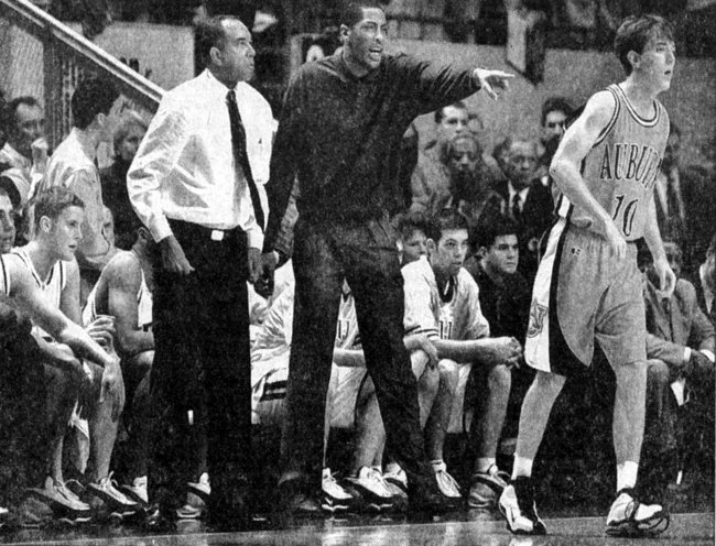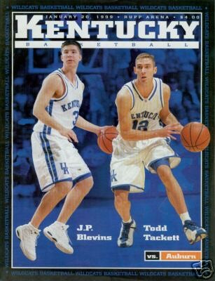 Tayshaun Prince started in the 2nd half in place of Ryan Hogan, and UK went to a man-to-man defense. Both sides began by missing FTs and a 3 pt try, before Turner had a nice driving layup for Kentucky's 1st double digit margin of the game at 33-22. The Cats immediately switched to a zone defense, which didn't stop Porter from dunking a N'Diaye miss. The refs called a jump ball (going to Kentucky) while the replays showed that there was never a jump ball situation (after a Pohlman miss, the ball was still bouncing around between several players). Evans hit a tough 16 footer, and the crowd "Mu"ed as the score went to 35-24 Cats. A Prince miss was tapped back in by Bradley, and it was 37-24. Auburn experienced difficulty from the tougher Wildcat defense, as they hit only 1 of 7 FGs to start the 2nd half. B Smith and Prince exchanged 3s, then Turner had a 10 footer which made it 42-27 UK. Kentucky was doing a better job on both offensive and defensive glass in the 2nd half. Porter made 2 FTs and Evans had a driving layup, then Pohlman hit a 3 while Camara made a 10 footer, and it was 46-32 Wildcats. Porter had a putback dunk, then after several UK misses, he made 1 of 2 FT attempts (Porter had N'Diaye open right under the basket, but insisted on scoring himself, and Evans made sure that he went to the line). Auburn cut the lead to 46-37 after Heard stole the ball and went in for a layup, but Evans put back an Allison miss and was fouled, completing the old- fashioned 3 pt play for a 49-37 Kentucky margin. N'Diaye had a dunk after good passing by Auburn, but Evans answered with a 3 off a good screen. Auburn hit 3 pointers on their next 2 possessions (by Pohlman and Porter), which sandwiched a Bradley dunk and an exquisite Bradley reverse layup, to make it 56-45 Kentucky. Auburn missed twice on its next possession, but the Cats were guilty of an offensive foul, and after another Auburn miss, Turner hit a leaning 8 footer and was fouled, completing another old-fashioned 3 for a 59-45 UK edge. Robinson missed a couple of shots, and Turner missed but by now UK was doing better on the offensive boards and had another possession. Heard finally hit a 15 footer, and Auburn's press began to bother Kentucky as Bradley turned it over. Prince and Porter missed FTs and FGs, but finally Heard made a shot, and it was 59-49 UK. When Porter nailed a tough 12 footer, it was 59-51, and the Rupp Arena crowd grew restless in the face of an Auburn rally. But Turner was fouled by B Smith, and made 1 FT, Bradley hit an 8 footer, and it was 62-51 UK. But the Tigers were not finished - N'Diaye had a putback shot, and when Heard made an open 3, the lead was down to 62-56 Kentucky. Heard fouled Turner, and the double bonus was in effect. Turner again hit only the front end his 2 FTs, but he was fouled on the next possession and again went to the line. For the 3rd time in a row he hit only his 1st shot (each 2nd FT try was far too short), but by now the margin was 64-56 Kentucky. After several Auburn misses on their next possession, Turner was fouled and this time made both FTs, so that the lead was again double digits at 66-56. Bradley put back an Evans miss to make it 68-56, then Robinson hit a 3, after which Evans made 2 FTs for a 70-59 Cat lead. Heard made another 3 as time wound down, and Evans again made 2 FTs. After the last Auburn miss, and UK in possession with 10 seconds left, Auburn did not challenge the Cats and allowed time to expire with Kentucky earning the 72-62 victory.