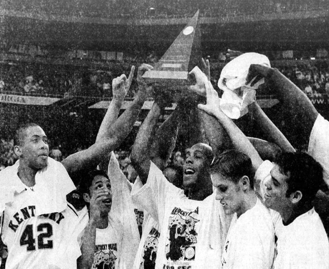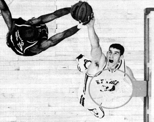 Scott Padgett loses a rebound to Arkansas' Derek Hood
