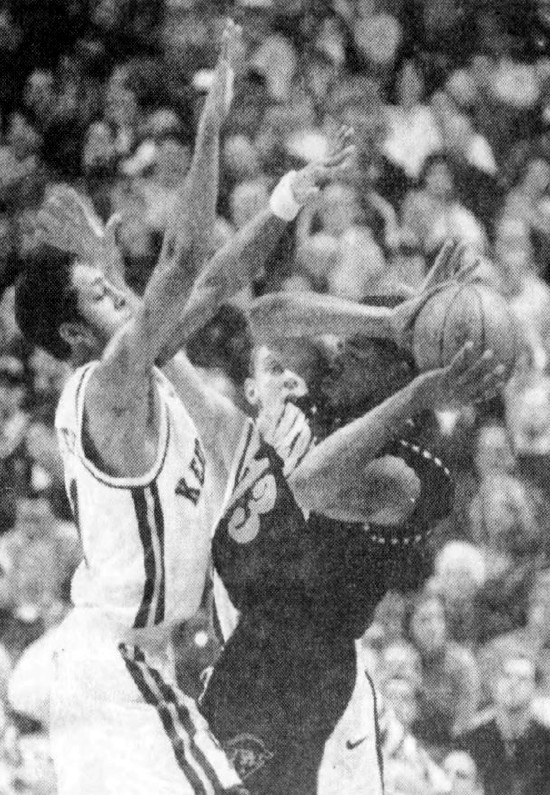 Kentucky jumped on the back of Jamaal Magloire and charged back to the front on the strength of a half ending 15-6 run. The Cats took the lead when their big center made a nifty move on the baseline off a Todd Tackett feed and was fouled. The Cats led 22-21 and Vandy would never lead again. Magloire nailed the free throw to complete the three point play. Moments later a Magloire postup basket gave the Cats a 24-21 lead.