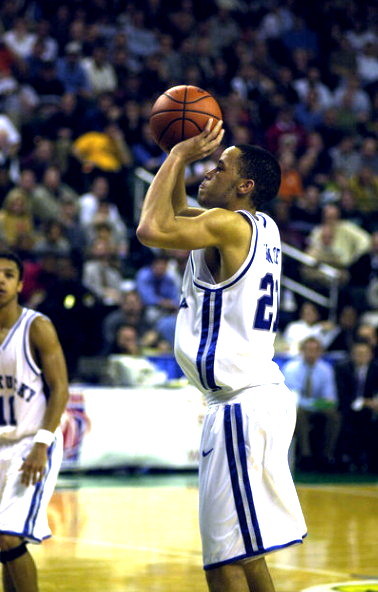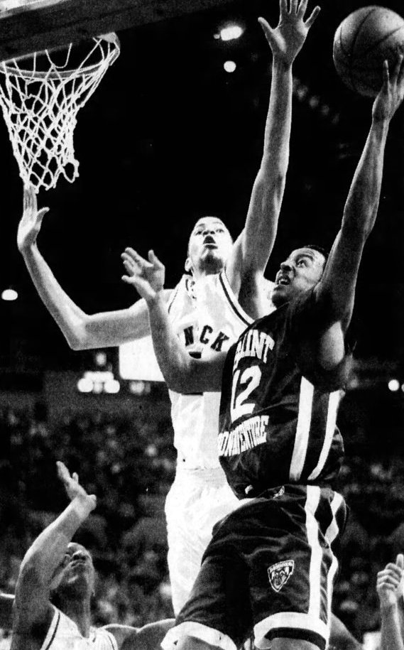 ...but not before 5-foot-10 Tim Winn of St. Bonaventure attempts to win the game with a shot over Jules Camara (#40) and Tayshaun Prince (#21)