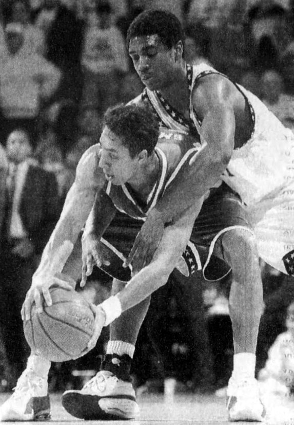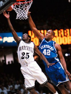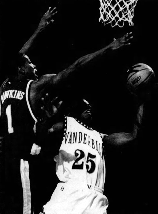 Vandy's Chuck Moore (#25) tries to shield his shot from Cliff Hawkins (#1)