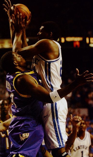 Tayshaun Prince (#21) is guarded by LSU's Ronald Dupree