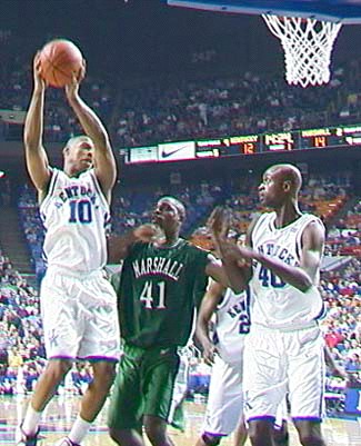 Kentucky maintained a margin between 17-20 points until midway through the second half when Slay scored 10 consecutive points, including a 4-point play, to pull Marshall within 13. His old-fashioned three-point play at the 9:07 mark cut the deficit to 69-57, but the Cats responded with a 3-pointer by Gerald Fitch, consecutive fast-break jams by Estill, and a 3-pointer by Bogans to blow the game open.