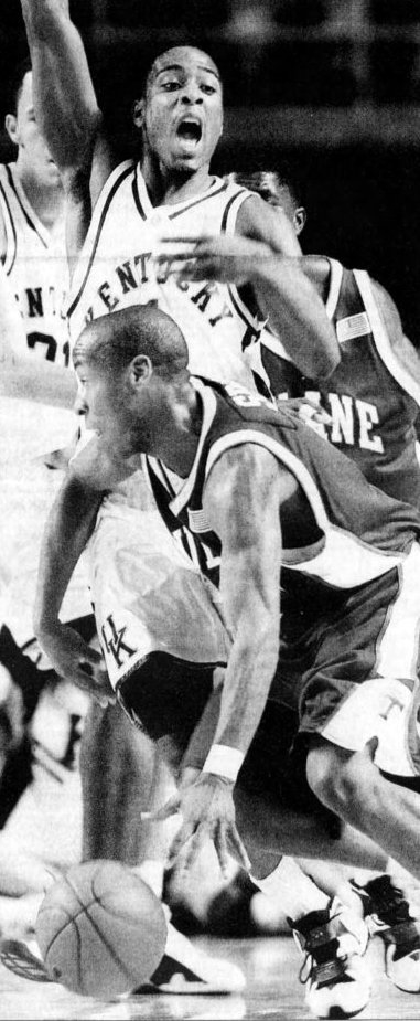 Kentucky made that clear from the start as Prince and Jules Camara had each scored four points to stake their team to an 11-2 lead. Smith called upon the bench just under the 15:00 mark, and Carruth, Marquis Estill and Chuck Hayes each responded with baskets. Estill, a center, and Hayes, a power forward, hit the first of UK's 16 treys on the night to make it 19-4.