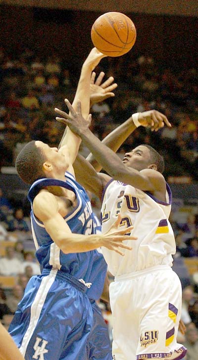 Tayshaun Prince blocks the shot of LSU's Antonio Hudson