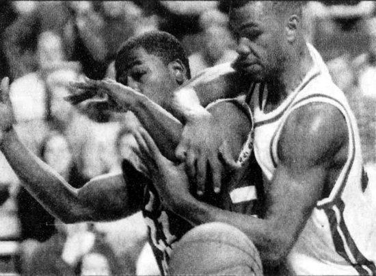 Chuck Hayes battles High Point's Joe Knight for the ball