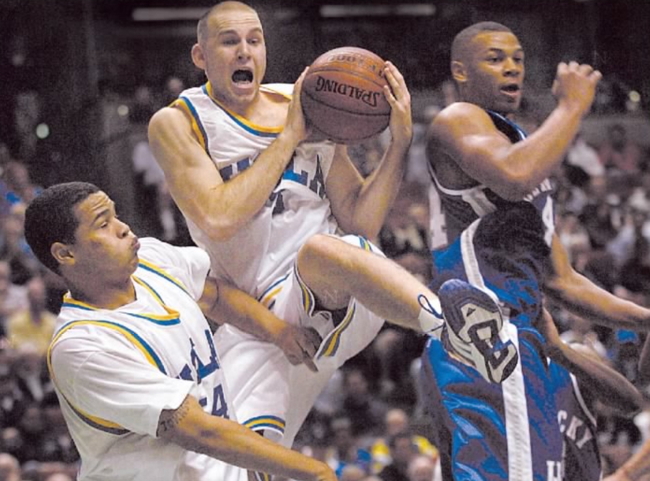 UCLA's Brian Morrison grabs a rebound in front of teammate Josiah Johnson and UK's Chuck Hayes