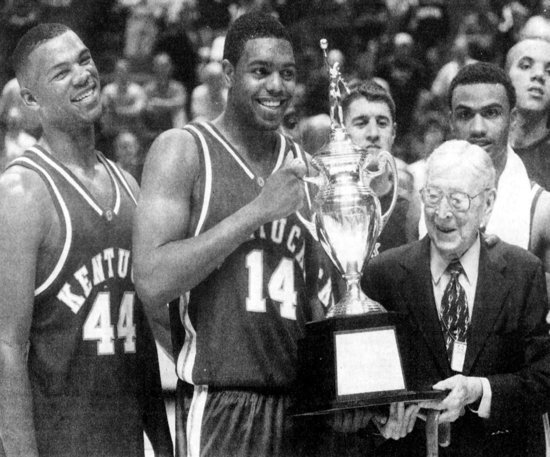 Erik Daniels (#14) is given the Wooden Classic Trophy by former UCLA coach John Wooden while Chuck Hayes (#44) and the rest of the team looks on
