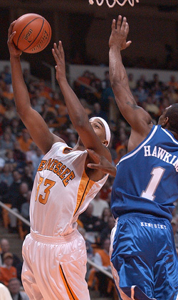 Hawkins' shot got the Cats into overtime, where UK quickly fell behind 66-64 on Scooter McFadgon's baseline jumper. Erik Daniels then offered an unlikely lift, swishing a three-pointer from the top of the key with 4:25 left to give UK a 67-66 lead. Daniels, who scored 19 points, had made just 2-of-11 from three-point range all season before hitting the critical jumper.
