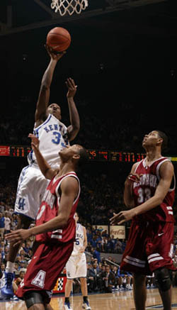With UK (17-3, 7-2 SEC) crawling out of the gate, scoring just four points in the first eight minutes to fall behind 13-4, the Cats needed a spark. Starting his second game in place of the injured Gerald Fitch, Barbour lifted both the crowd and his own spirits, going on a binge where he banged home eight points in just over two minutes to cut the Alabama lead to 15-13. The spurt got the crowd going and UK's defensive pressure picked up, hounding the Crimson Tide (11-9, 3-6).