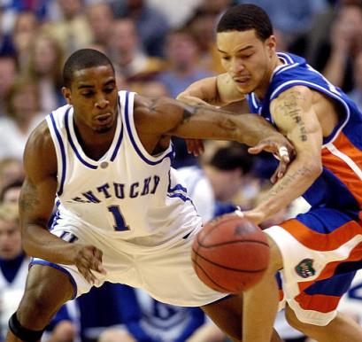 Ravi Moss (#2) battles Florida's Matt Walsh and Bonell Colas for the ball