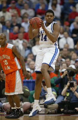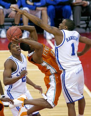 Cliff Hawkins (#1) defends against FAMU's DeMarcus Wilkins