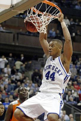 Chuck Hayes (#44) dunks in front of Michael Ayodele