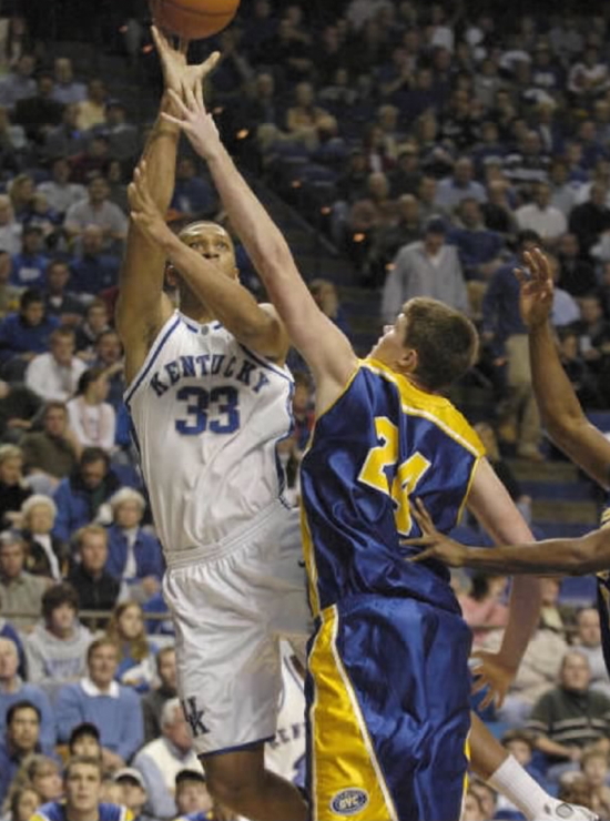 Randolph Morris (#33) shoots over Morehead's Jonathan True (#24)