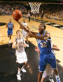 UK seems to be more comfortable as well, but it took a clutch play by Hayes that sparked a 14-2 second half run to put the game away. Ahead just 57-45, Hayes produced a steal that led to a Patrick Sparks lay-in, then raced back downcourt and swatted away a Smith lay-up attempt that led to two Perry free throws and a 61-45 lead. The edge ballooned to a game-high 71-47 with 9:51 left on a Ravi Moss putback before UK lost focus in the closing minutes and allowed Vandy to cut the final score to a respectable margin.
